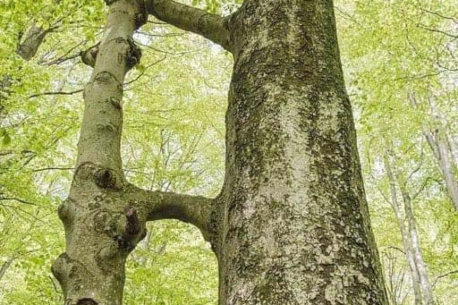 The thinner tree was cut years ago and the big one has been holding and feeding it since then. They “wake up” together in the Spring and “go to sleep” together in the Fall.