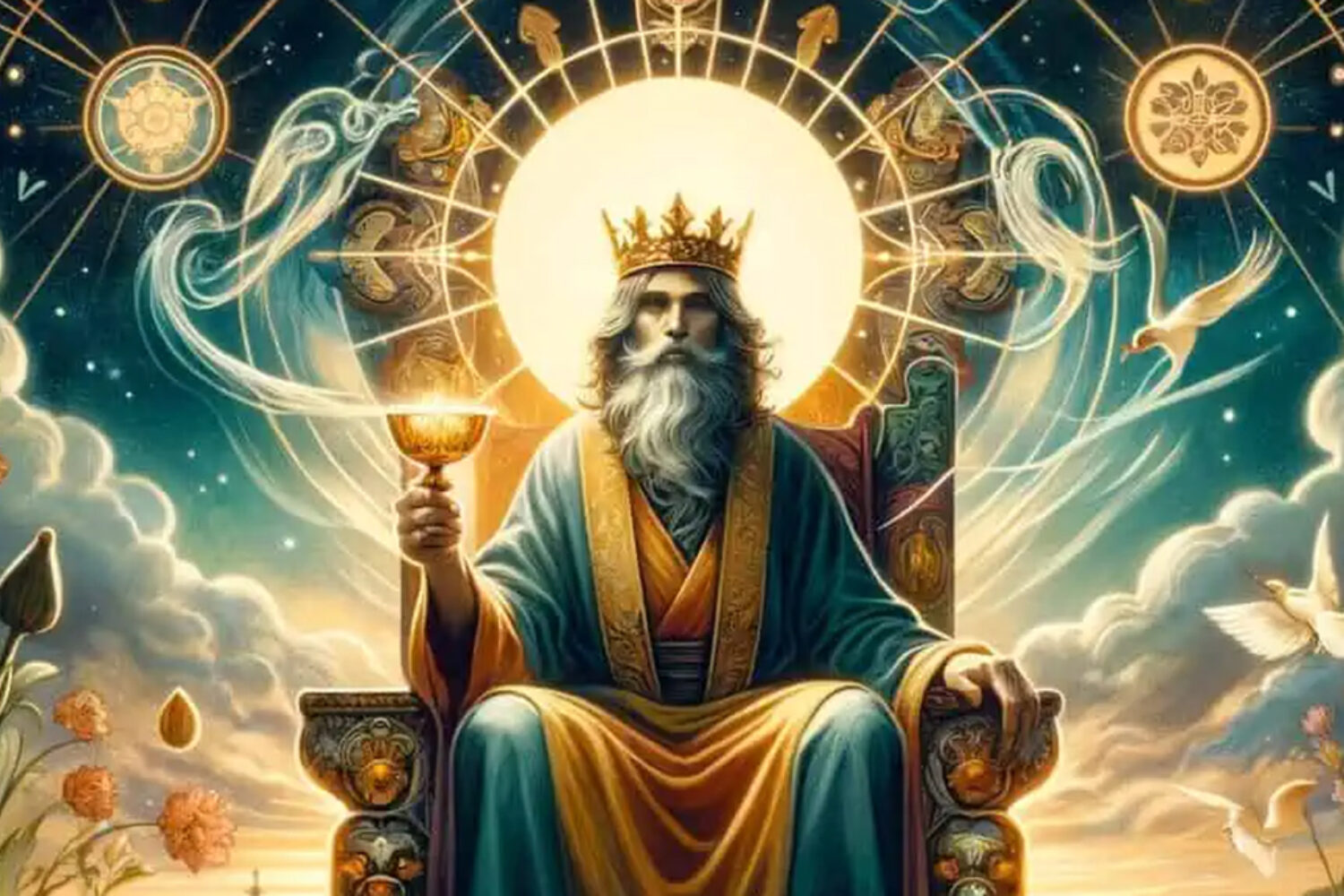 The King of Cups in the tarot deck is a powerful archetype representing emotional maturity, compassion, and wisdom. Seated on his throne, he exudes a sense of calm and stability, radiating an aura of understanding and empathy. He holds a cup, symbolic of the element of water, which is associated with emotions and intuition.